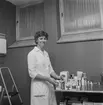 Utställningen Den gamla goda tiden - syster Elisabet Dillner framför sitt unika medicinskåp, Uppsala 1942