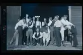"Sällskapsresan i Dalarne, inkvartering på en loge. Prosten Holm, Eskilstuna tar på sig byxorna." Text på negativ: "Wid Ornäs 25-6. 1921" Morgontoalett. En grupp män varav några klär på sig byxorna och ett par rakar sig medans en vän håller en fickspelgel. Sittandes till vänster Axel Fredriksson.