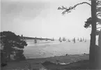 Från uttagningsseglingarna i juli 1947 inför seglingarna i USA om Scandinavian Gold Cup senare samma år. Den sittande mannen t h är Gunnar Lund (1884-1973), KSSS mångårige mätningsman.