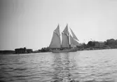 Enligt text som medföljde bilden: "Tremastade slätskonerten Hedvig från vår veranda".