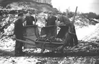 Nödhjälpsarbete. Schaktning på vägen Slätte-Hova strax norr om "Bålerudskorset". Början av 1930-talet. Man fick 14 dagars arbete här, 14 dagar på kyrkogården, 14 dagar på sågen osv. Fr v: 1. Sven Karlsson, Bremon 2. Gustav , Lillestan 3. Larsson, Lillestan 4. Georg Svensson, Myrhult 5. Vitalis Fransson, Grönehög 6. Gustav Larsson, Myrhult 7. Bertil Lindström, Granhaga 8. Algot Karlsson, Samfalla 9. Karl Karlsson, Bäckedalen Reprofotograf: Gunnar Berggren.
