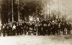 En stor grupp människor samlade framför ett hus. Troligen Skytteföreningens stuga.