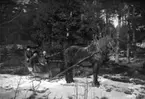 En islandshäst kopplad till en släde står på Brahegatan vid södra uppfarten till torget. Tre barn sitter i släden och en kvinna, Anna Malmborg, står intill.