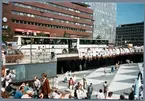 Bilden föreställer en vy över Kungsbron i Karlskrona. På kajkanten och på gatan står det mycket folk. På vattnet i förgrunden pågår en livlig trafik med småbåtar.