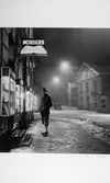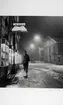 "Tökväll". "Norders hörna" korsningen S:t Olofsgatan-Storgatan. Från utställningen "Falköping i bild" 1952. Ragnar Spetz på trottoaren.