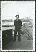 Denna gruppfoto visar fem flottister på en bryggan. Längst fram står en maskinist i graden flaggkadett.