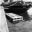 Simtävling i Systraströmmen. Bilden är tagen vid målet. Simmare och fuktionärer står på målflotten, funktionärer och åskådare finns i båtar runt målet.