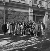 Ett sällskap om om 23 ungdomar, kvinnor och män, uppställda för fotografering utomhus. En av kvinnorna har ett kakfat i knät och bredvid henne ligger en man och röker.