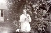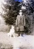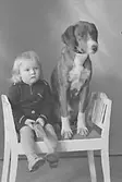 Köksingången till Knutstorp. Sigge Flachs hundar (de svarta), den ene vid namn Murre, den andre hette Daylight. Den vita hunden är Margo, och hörde till Knutstorp. Kapten Sigge Flachs samling, Prinshaga, Axvall. Fotograf: Maria Berg, född Flach.