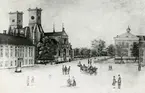 Järnvägsgatan vid mitten av 1880-talet. På bilden synes det av Skaraborgs läns allmänna sparbank 1874 uppförda bankhuset, som sedermera försålts och påbyggts med en våning. Det nuvarande stora bankhuset invid det förra uppfördes 1904.