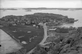 Tryckt text på kortet: "Flygfoto över Grebbestad." "Ensamrätt & Foto: A/B Flygtrafik, Dals Långed." "Förlag: Hallmans Bokhandel, Uddevalla."