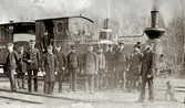 Trelleborg Övre år 1902. Fr.v. Stk. Jöns Olsson, notisbud Gustav Holmkvist, sts. Ludvig Holmberg, sts. Julius von Platen, stk. Olof Nilsson, Nils Sjöholm o Håkan Persson, vagnputsare G. Roslund, f.d. stk. Anders Roskvist. MTJ lok.