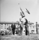 Militärövning på Huseby, 1917. Genomgång av övningen, utanför huvudbyggnaden på Huseby. Militärerna är iförda blandade modeller av militäruniform, några dock i m/10.