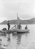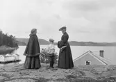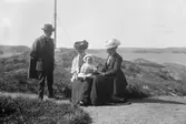 En pojke sitter på ett verandaräcke, bredvid honom står en kvinna med armen om pojken, Villa Klippan, Gustavsberg