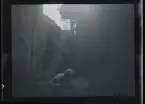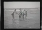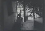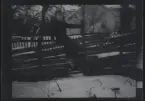 Tre barn sitter på en kälke utanför ett hus.