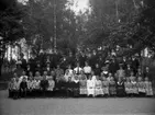 Gruppbild, skolbarn, byggnad i bakgrunden.