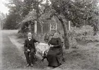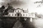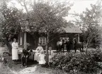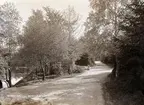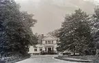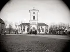 Mariestads Teater med "telefontornet" syns i bakgrunden. Affärsskyltar: Johanna Hieronymus & Co Tapisseri- Hvit- och Kortvaru- affär. Anna Hofgren Modehandel. A G Andersson Slagtare Olof Olsson Jernhandel