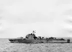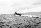 Bilden föreställer en så kallad flygande banan - en helikopter typ Vertol 44 under flygning knappt över vattenytan. I förgrunden ser man fördäcket av en minsvepare.
