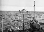 Bilden visar det tyske lätt kryssare Karlsruhe som precist har avlossat sina kanoner. Svarta rökmoln stiger mot himmelen.