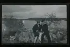 "Ruth Gustavsson o Elov Ericsson." En kvinna och en man i sjömanskostym sitter på en berghäll vid vatten.