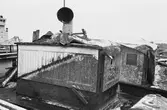 Längst t.h. Skeppsbyggmästaren Henrik Gustafsson som dirigerar inlyftningen. Obs. balken som är stucken genom huset och vilar i wirar.