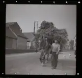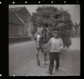 Veteskörden körs hem till gården hos Hilmer Engström. I lasset från vänster gårdsägaren Hilmer, hans far Johan Engström och August Larsson.