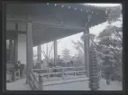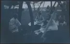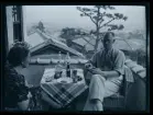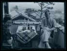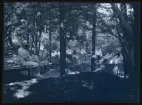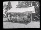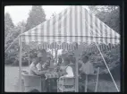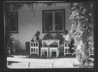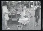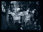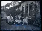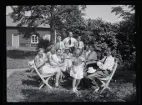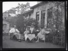 Ett sällskap sitter ute och fikar i en trädgård.
