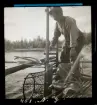 Vinterfiske på sjön. En man hugger upp ett hål i isen.