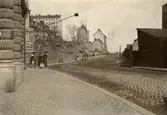 Vy över Kungsgatan med Kungstornen, Stockholm. Spårvagnstrafik och fotgängare.