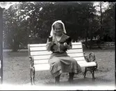 "Husmodersskolan". Kvinna sitter på parkbänk med två svarta kattungar i famnen.