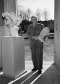 "Skulpturutställningen i Upsala tar form" - Bernhard Berg med skulptur av Axel Wallenberg, Linnéträdgården, Uppsala maj 1947