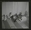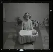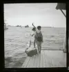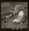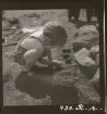 En liten gosse som leker med sina leksaker, och seglar en båt i en balja.