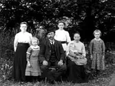 EN FAMILJ VID ETT BORD UTE I TRÄDGÅRDEN.