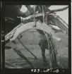 Ställning för likakja, med böjda björkstammar för duktäckning. Kuolhensaari, Kiellijärvi, Karesuando sn.