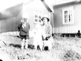 Modern Anne-Marie Lindholm, med barnen Marie-Louise och Benny, står i trädgården. I bakgrunden ses gaveln på Roten K 22, 1950-tal.