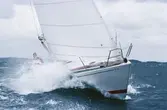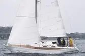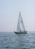 Albin Nova vid brygga i Fiskebäcks hamn. Representant från Albin Marin i sittbrunnen.
