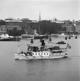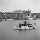 Närmast syns ångf Polstjerna, bakom stäven ligger ångf Nya Kinda. Flera namnkända fartyg på andra sidan Göta kanal.