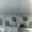 Övervåningen, matsalen (rum nio). Tryckt papperstapet i färger. Årstiden. Dufours art. Arthur & Robert? Årstiden (över dörren). Överstycket finns exakt lika på Kläckeberga.