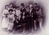 "Muntrationsklubben på Ranten. De agerande i pjäsen "Magister Bläckstadius". Översta raden från vänster: Olga Blomberg, gift med Sam. Rundgren. Sittande med häftet i handen Lexen Blomberg. Övriga sittande: Hildur Hall gift Modin, fru Ida Svensson, Levis Hall (i blommig blus). Stående från vänster: Olga Blomberg gift Rundgren, Sven N.E. Alexanderson, Ingeborg Rundgren gift Alexanderson, 4:e damen okänd, Sven Ahl, Alexia Blomberg gift Noring, Sam. Rundgren, Karl Nordin. Namnuppgifter av köpman Sven Larsson, Dotorpsgatan 45, Falköping.