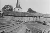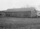 Färjestadens gård, ladugården. Närmast fähus. Skiftesverksbyggnader, rödfärgade. Bundna halmtak.