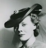 "18. Molyneux. Vinröd stråhatt, baku, sammetsband och flor i samma färg". Modell i hatt med låg kulle och svängt brätte. Hattnål.