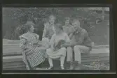 Kungligheter tar emot uppvaktning från Uppsala Studentkår på Universitetshuset trappa - kronprinsessan Louise, kronprins Gustav Adolf, kung Gustav V, prins Eugen, prins Carl, prinsessan Sibylla, prinsessan Ingeborg och rector magnificus Thore Engströmer