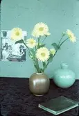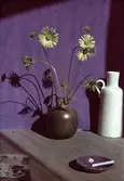 Bägare, muggar samt en vas från Bo Fajans, formgivan av Allan Ebeling och Eva Jancke-Björk, 1900-talets mitt.