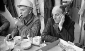 Kommer stämpeluret sticker vi 18 januari 1967 En byggnadsarbetare klädd arbetskläder sitter vid ett bord under en fikarast och röker. Han har en morakniv som hänger i ett snöre om halsen.