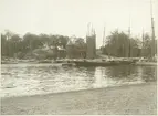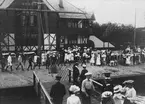 KSSS paviljong på Biskopsudden på Djurgården, uppförd 1930, inrymde sommartid sällskapets sekretariat. Motorjakten med namnet WINDY närmast kameran har inte säkert kunnat identifieras.