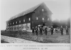 "Röda förrådet" på Malmen ca 1902 med första livgrenadjärregementets intendenturpersonal uppställd framför. Avfotografering av tryckt skrift.