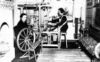 Fyra kvinnor i ett rum kardar, spinner och väver. En pojke sitter på golvet hos dem.