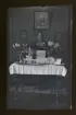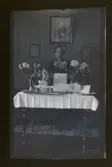 "Selma Larsson, Fogelstad" En kvinna sitter vid ett bord med telegram, gratulations-kort och blommor i vaser.