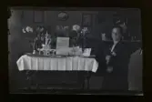 "Selma Larsson, Fogelstad" En man sitter vid ett bord med 50-års gratulationskort, telegram och blommor i vaser.