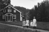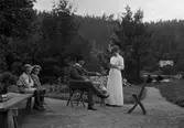 Tre personer står på en veranda, bakom dem är ett skynke upphängt som bakgrund. Personerna på bilden är Karl och Elisabeth Möller samt en av deras söner. Familjen Möller tillbringade många somrar på Gustafsberg och Elisabeth var även där som barn.